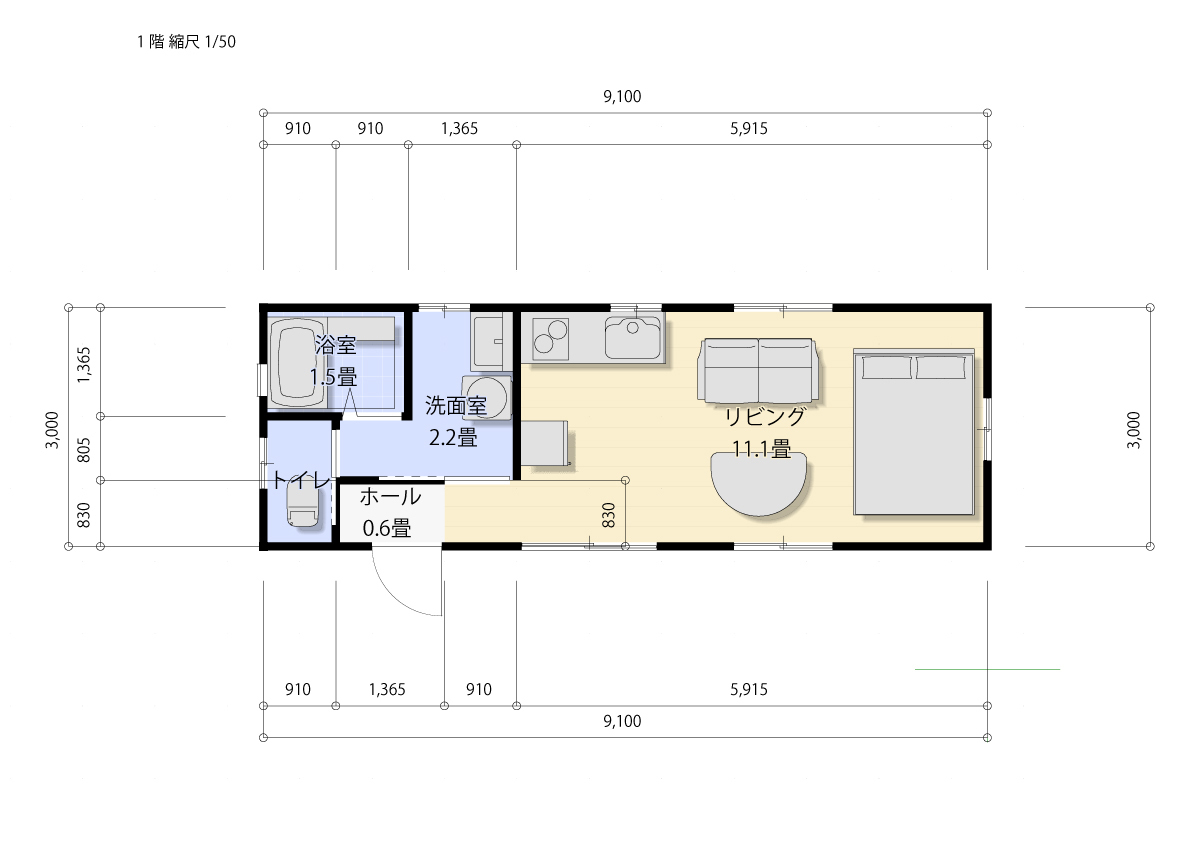 11.1畳のリビングダイニングを備えた、コンパクトで住居のほかスモールオフィスなど多目的に使えるワンルームタイプのトレーラーハウスです。