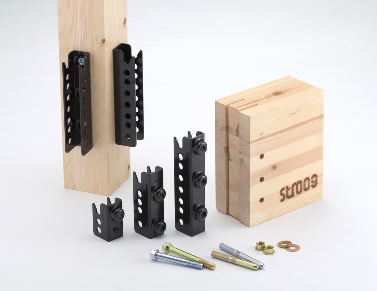 木材を落とし込んでドリフトピンを打ち込む施工方法なので、「工期の短縮が可能」。ナット付き梁受コネクタは、ホゾ内部にナットが溶接してあり、金物の取付時間を短縮することができます。